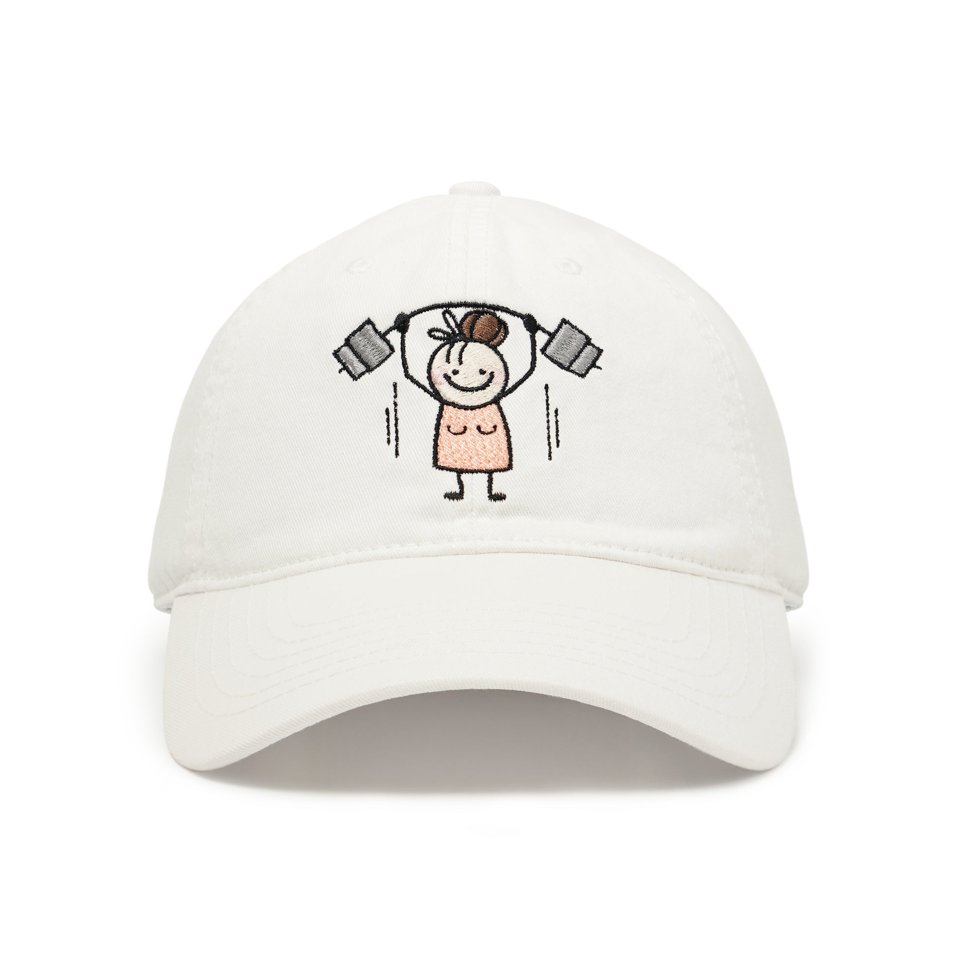 Make a statement with this bold cap, featuring an embroidered design of a girl lifting weights — playful, strong, and full of personality.